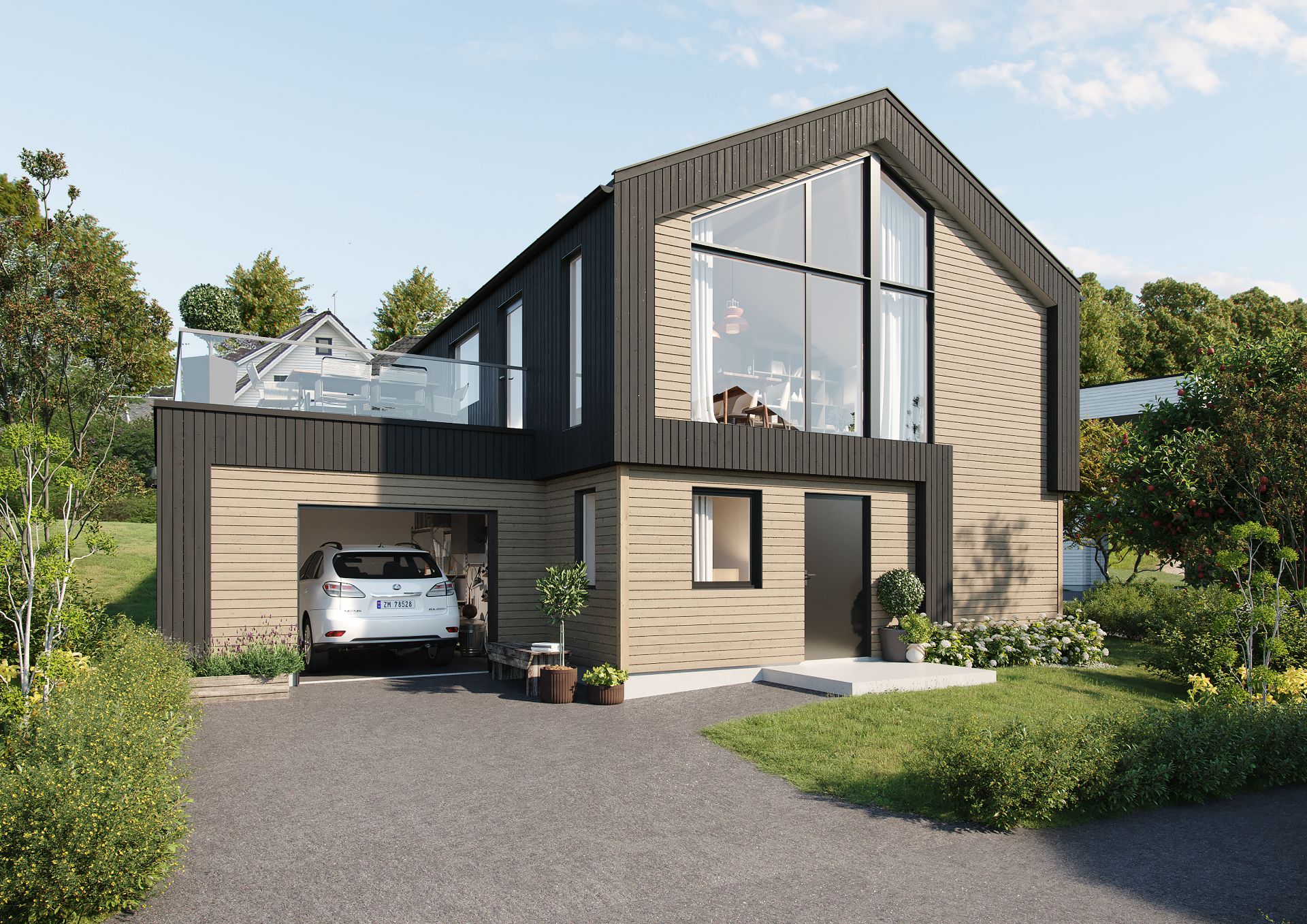Eneboligen er utviklet med samme arkitektoniske uttrykk som tomannsboligene i feltet, slik at området får et gjennomført og harmonerende preg.